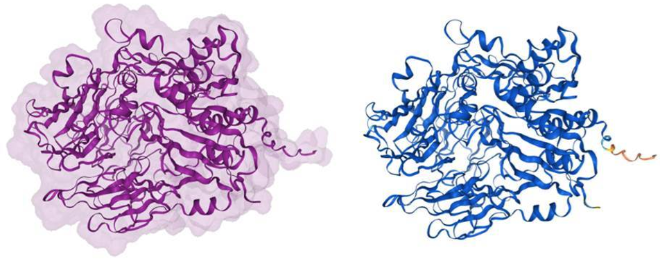 结构配色方案:按子单位(左图);结构配色方案:模型置信度(右图)